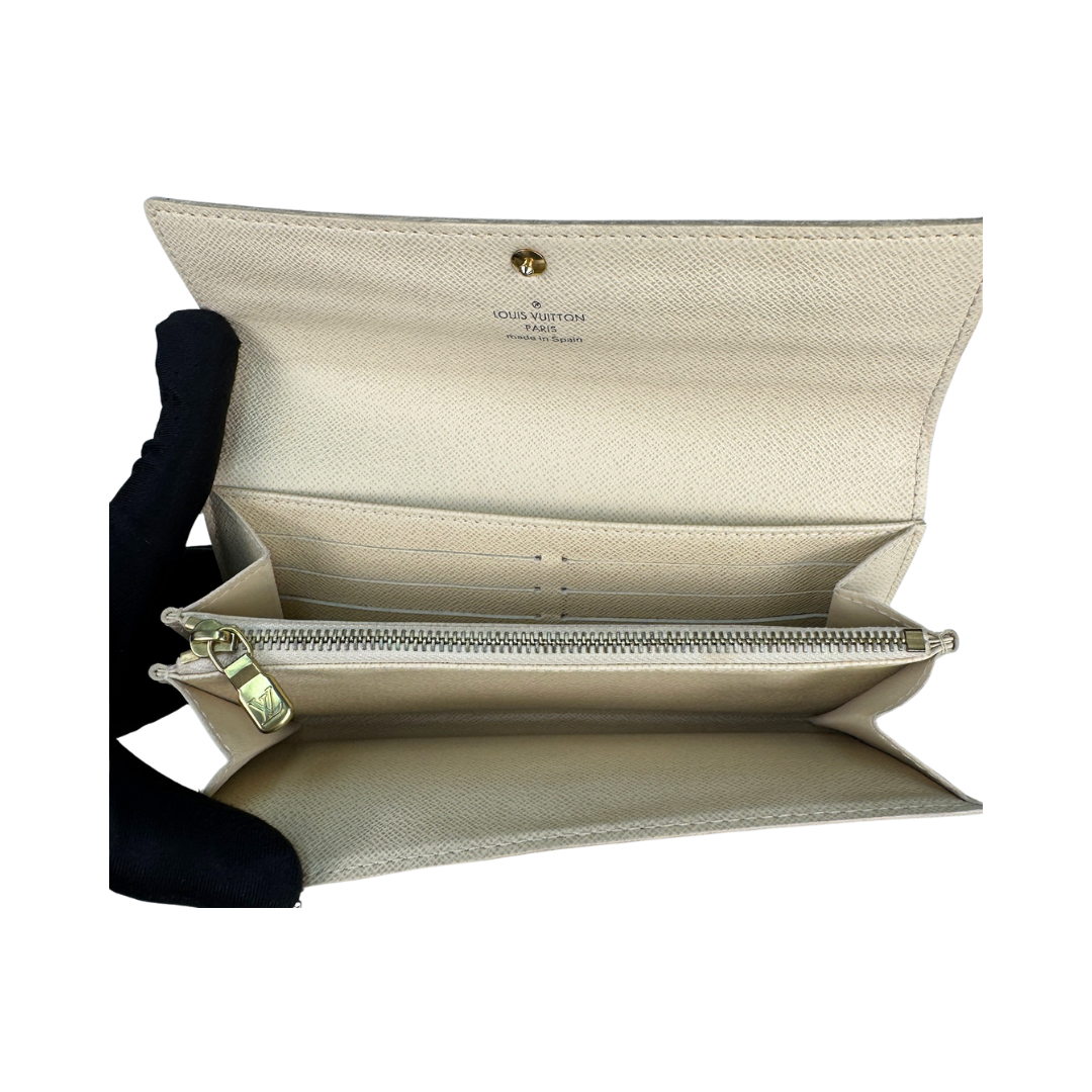 Classic LV Damier Azur coated canvas exterior with beige crossgrain leather interior and brass hardware. Features snap closure, 10 card slots, zipper change pocket, and several bill compartments. Includes certificate of authenticity, original dust bag and original box.