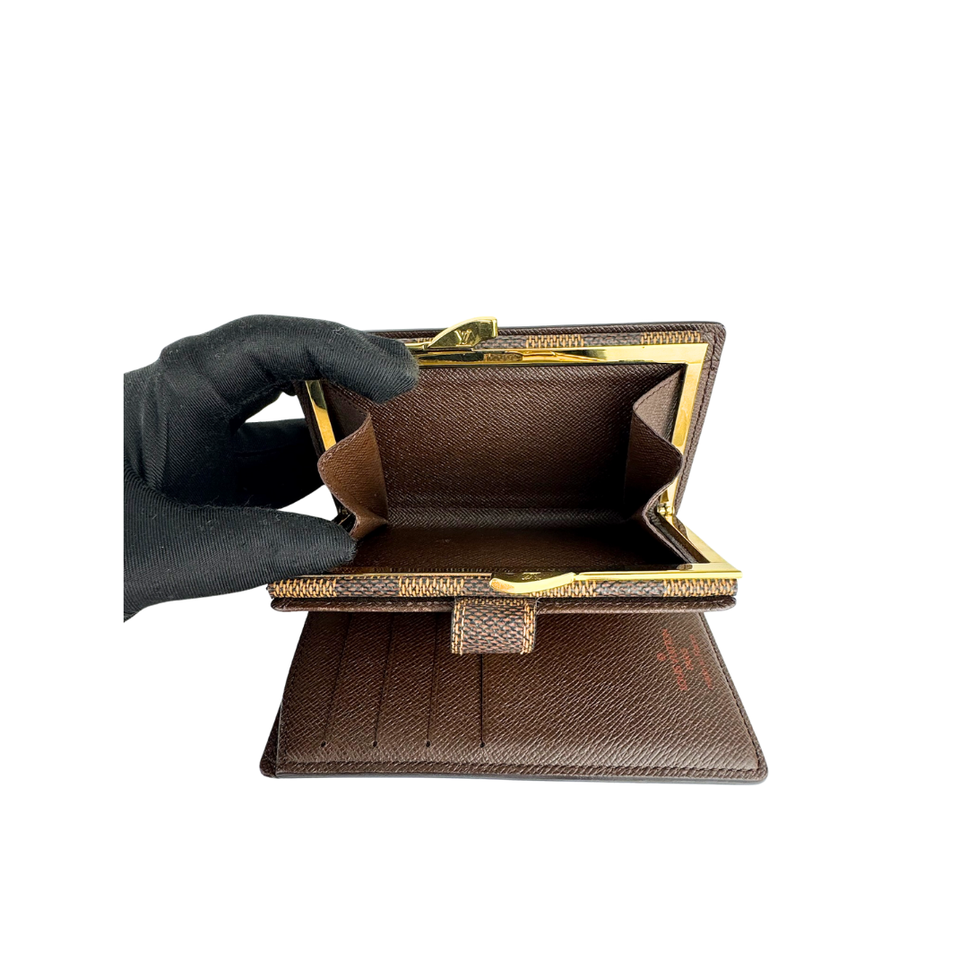 Classic LV Damier Ebene coated canvas exterior with dark brown crossgrain leather interior and gold-tone hardware. Features a snap closure that opens to 4 card slots, 2 patch pockets, and 1 bill compartment, an additional kiss-lock closure, and a coin purse. Includes original dust bag, box and certificate of authenticity.