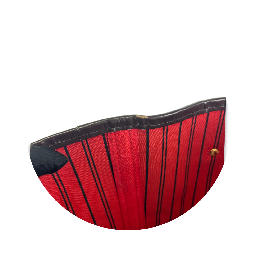 Classic LV Damier Ebene coated canvas exterior with dark brown leather trim, red striped interior, and gold-tone hardware. Features interior flap pocket with zipper and key ring. Please note minimal wear on top edge and corner wear as pictured. Includes original dust bag and certificate of authenticity.