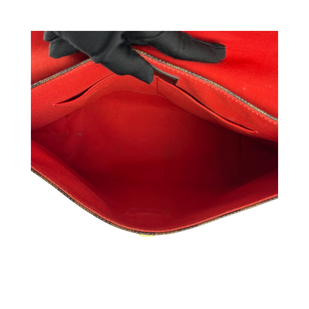 Classic LV Damier Ebene coated canvas exterior with dark brown leather trim, red canvas interior, and gold-tone hardware. Features turnlock closure, interior patch pockets, and adjustable shoulder strap. Includes original dust bag and certificate of authenticity.