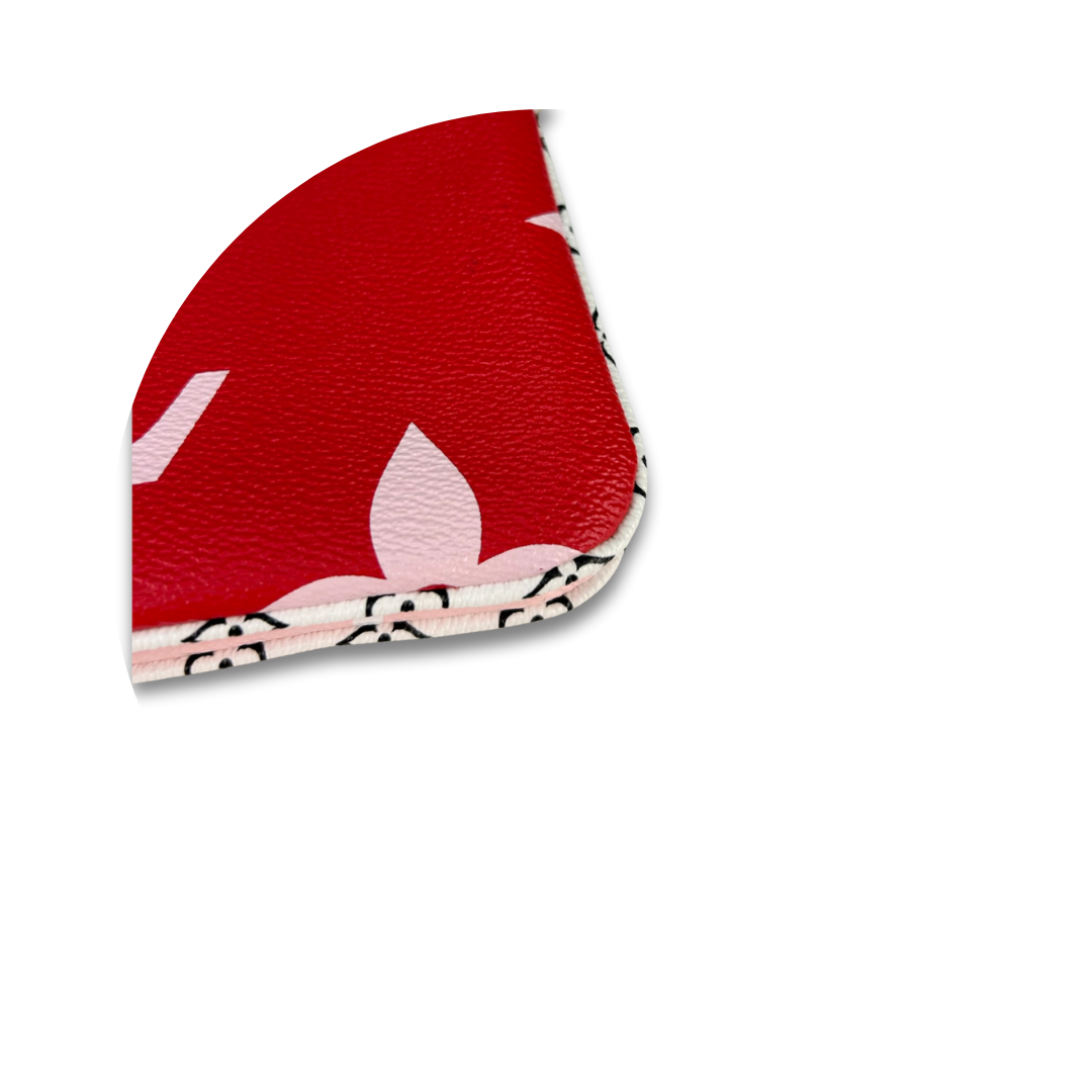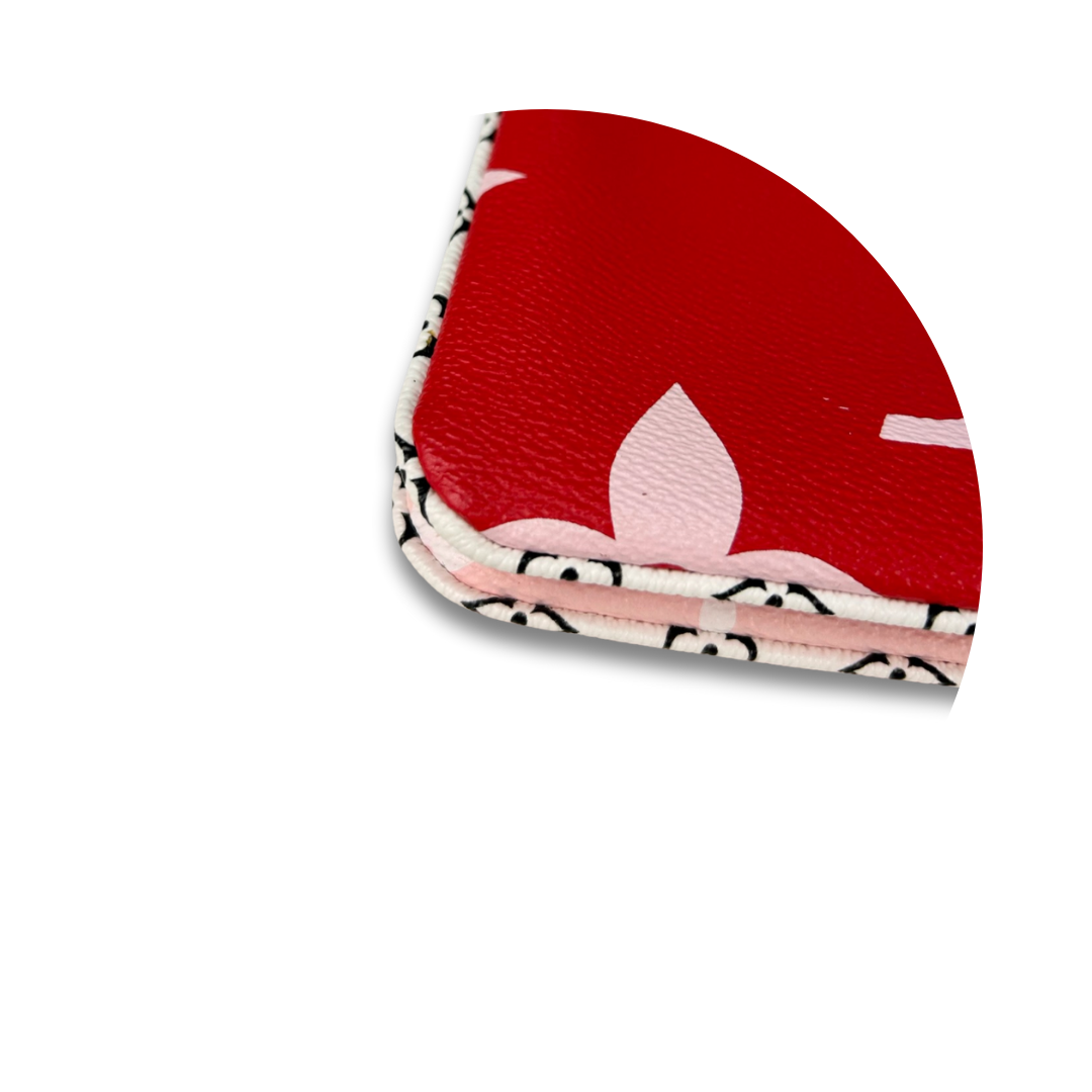 Reverse Giant LV Monogram in red and Classic LV Monogram in pale pink coated canvas exteriors with black and white mini monogram trim, pink microfiber interior, and gold-tone hardware. Features 2 zipper pouch openings, detachable chain shoulder strap, and 3 interior card slots. Includes a certificate of authenticity.