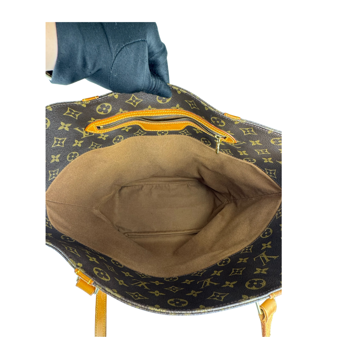 Classic LV Monogram coated canvas exterior with vachetta leather trim, brown coated canvas interior, and gold-tone hardware. Features long top handles, open top, and one interior zipper pocket. Includes certificate of authenticity.