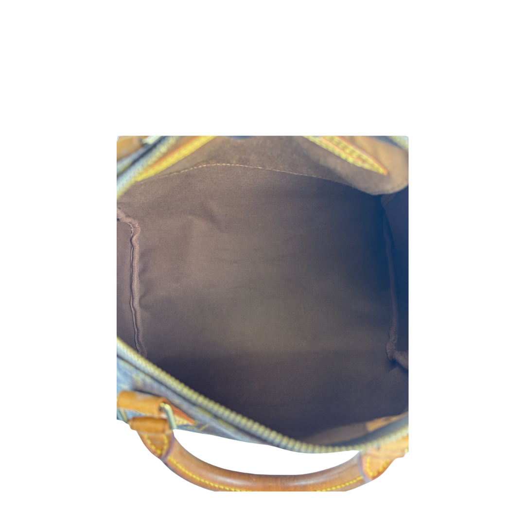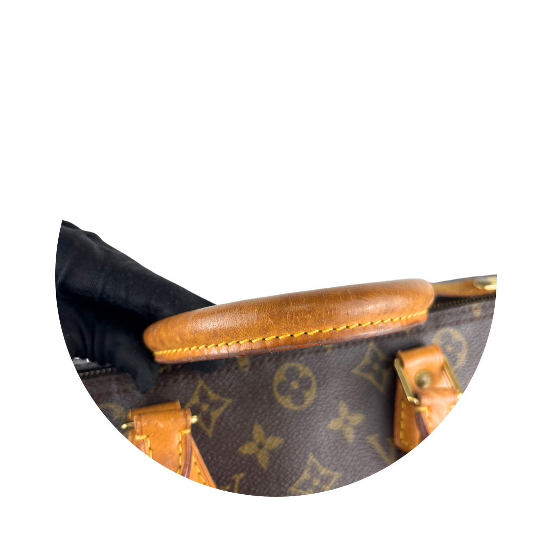 Classic LV Monogram coated canvas with vachetta leather trim, brown canvas interior, and gold-tone hardware. Features zipper closure and interior flap pocket. Please note moderate wear on handles. Includes certificate of authenticity.