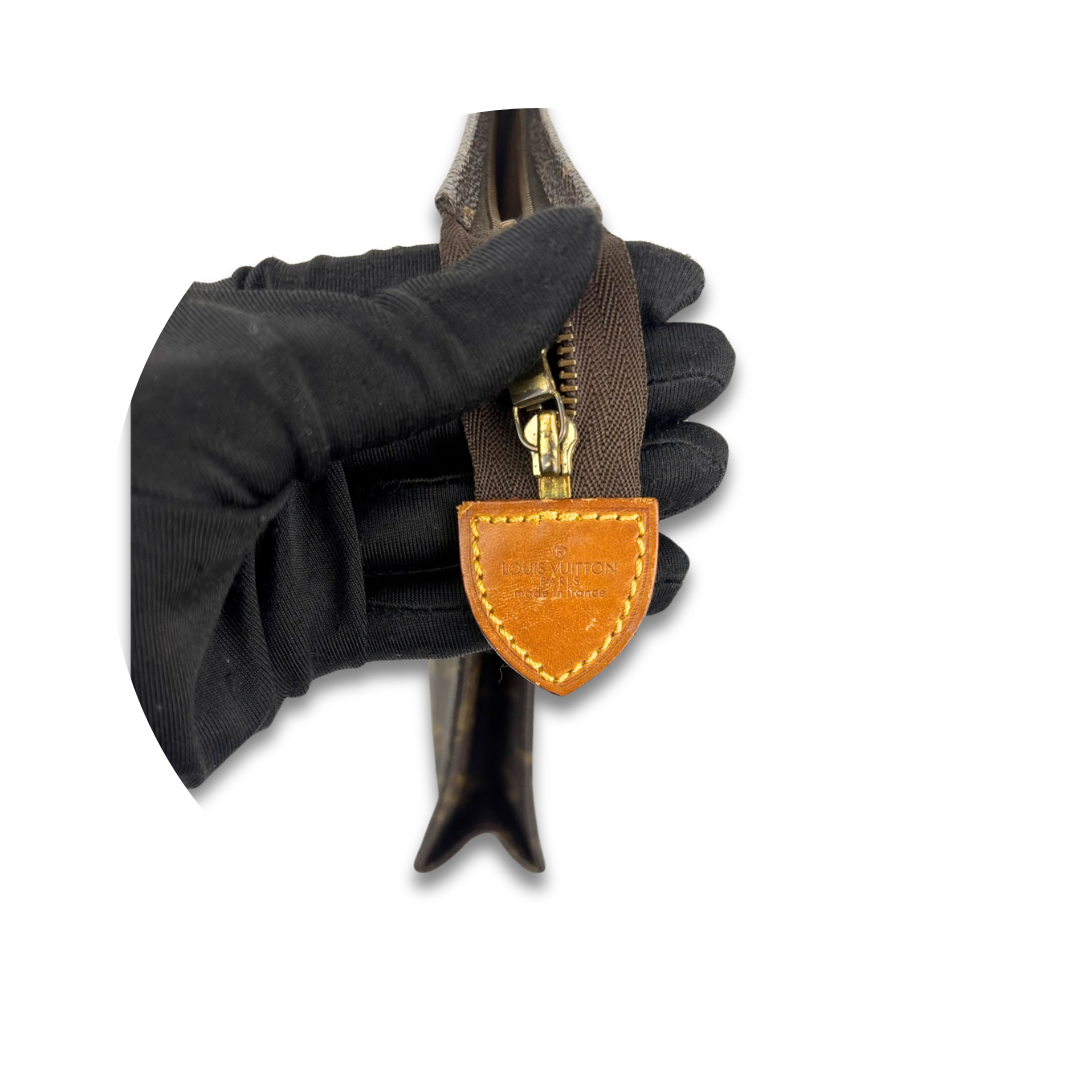 Classic LV Monogram coated canvas exterior with beige leather interior. Features zipper closure. Can be used as a cosmetic bag or clutch. Includes certificate of authenticity.