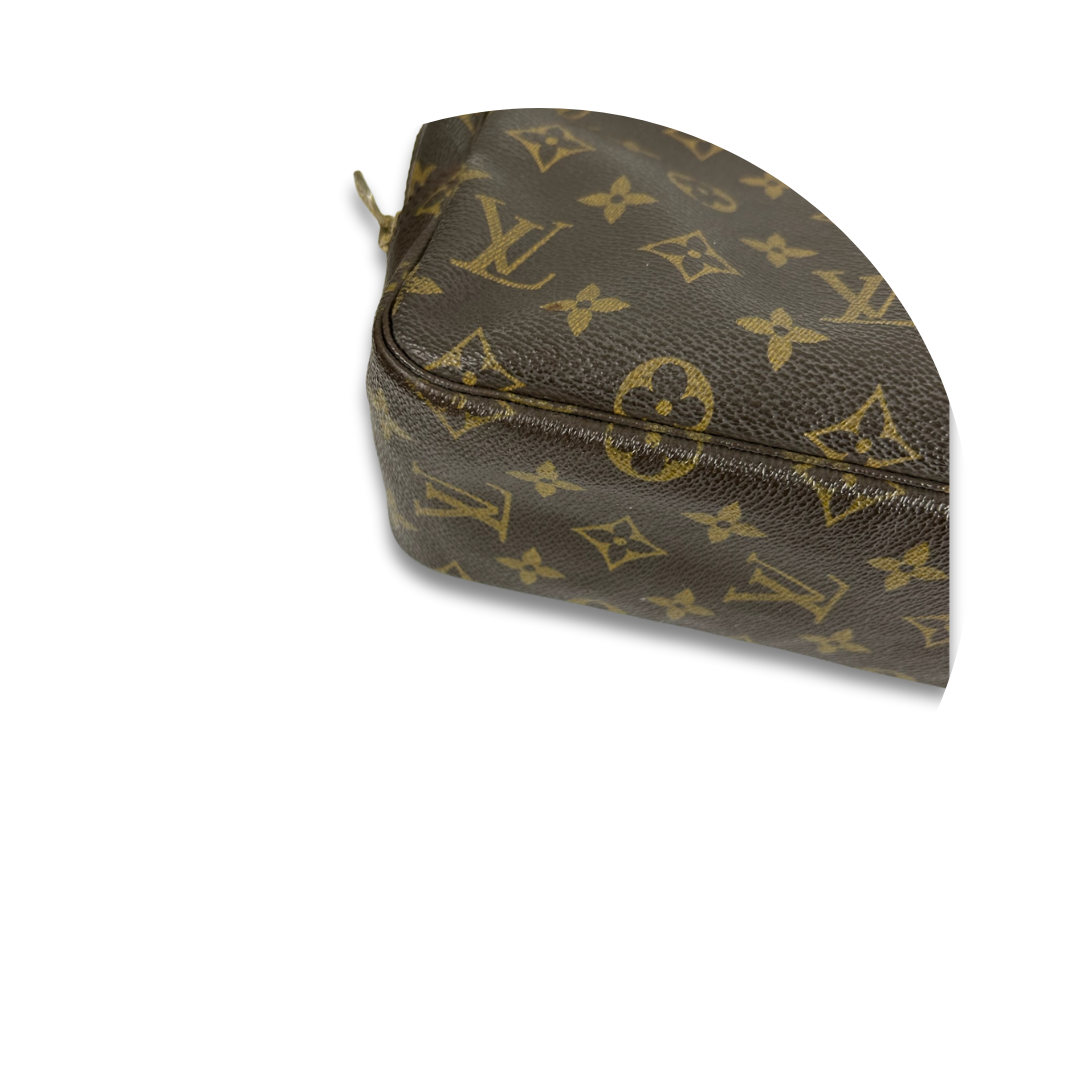 Classic LV Monogram coated canvas exterior with beige leather interior and gold-tone hardware. Features one interior pocket and 3 elastic bands to secure products. Includes certificate of authenticity.