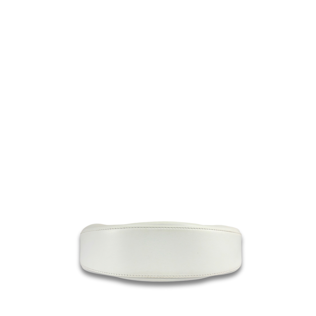 White puffy lambskin exterior with tonal jacquard interior and gold-tone hardware. Features zipper closure, removable chain strap, detachable and adjustable crossbody shoulder strap, and interior pocket. Please note color transfer on zipper trim, strap, and interior as pictured. Includes certificate of authenticity and original dust bag.