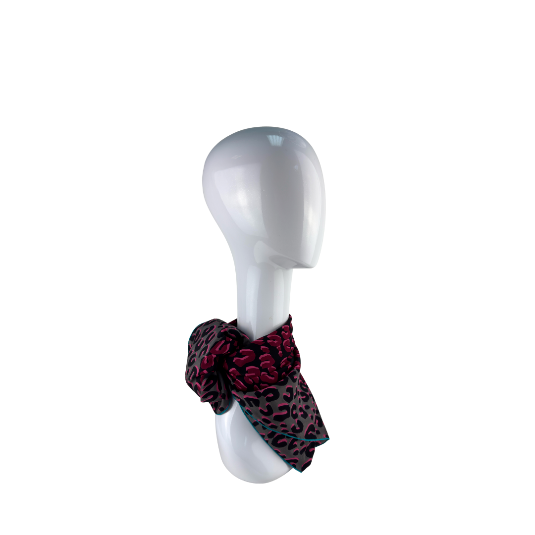 Black, grey, and magenta leopard print silk scarf with turquoise accent and hand-rolled edges. 100% silk.