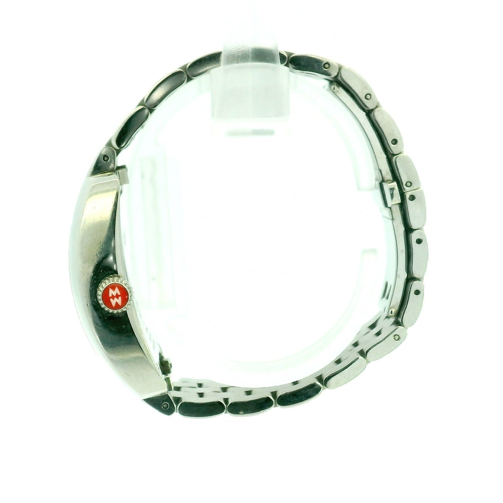 Stainless steel casing and link bracelet band with adjustable clasps. Features black guilloché dial, 19 inset brilliant diamond (0.09tcw) markers, and engraved MICHELE logos within the case walls. Includes certificate of authenticity and original box.