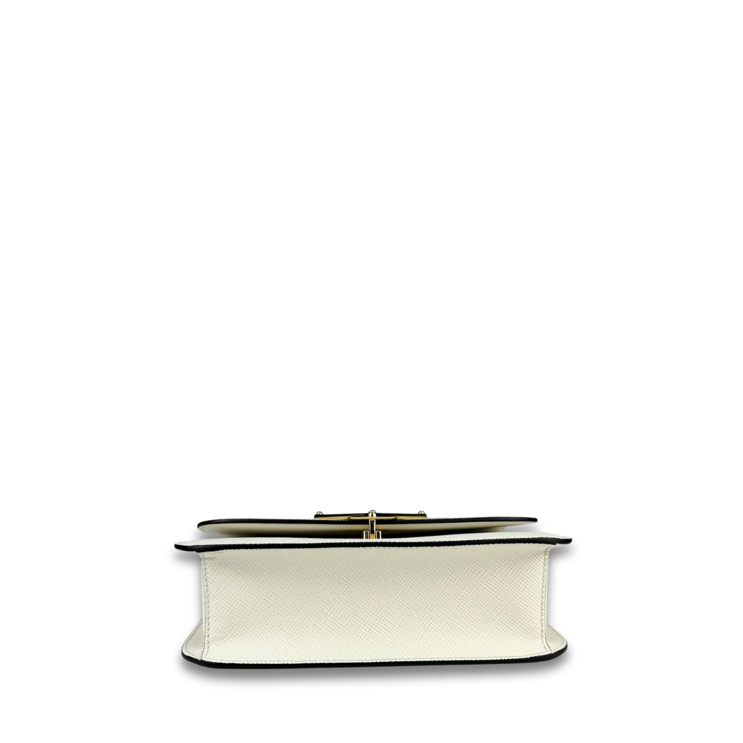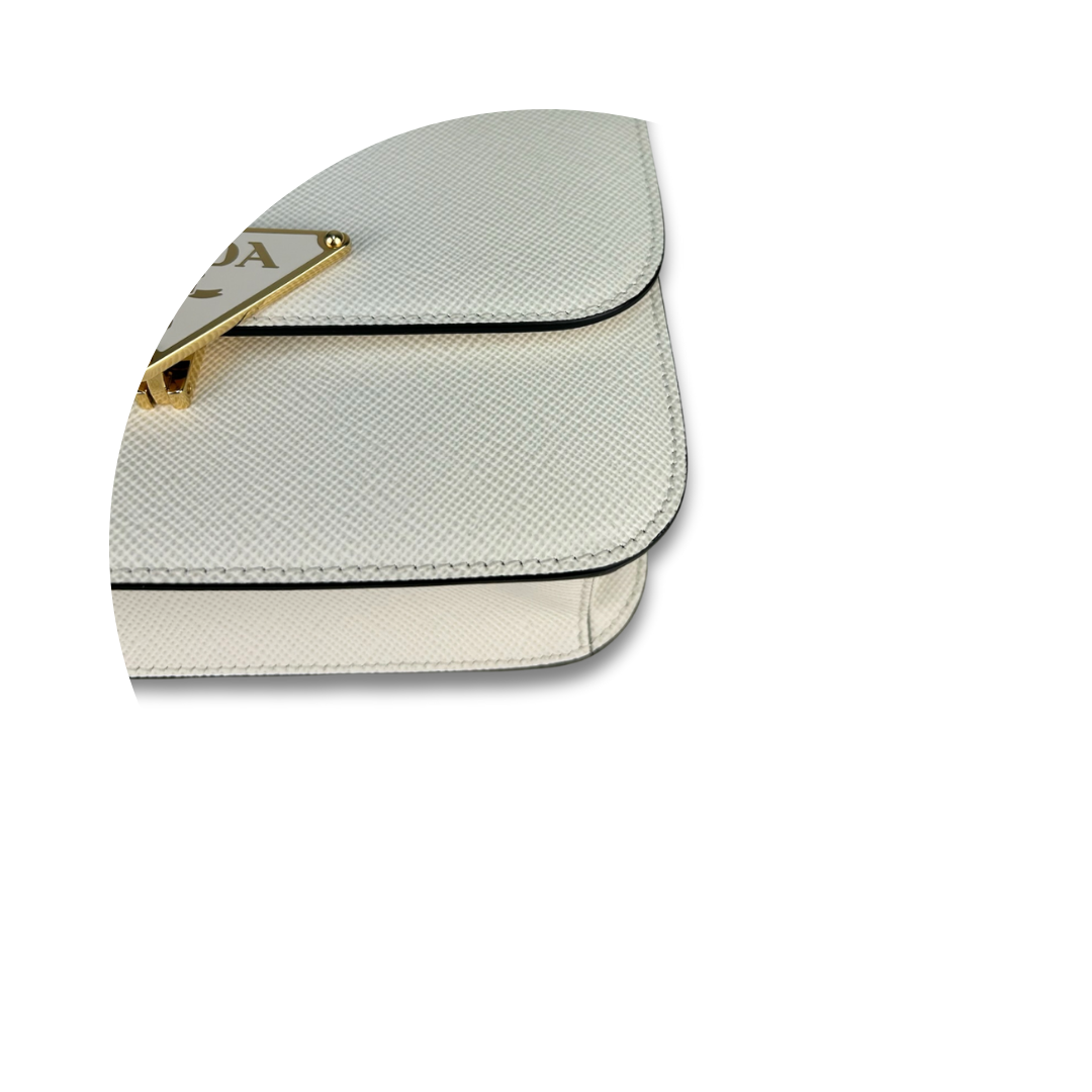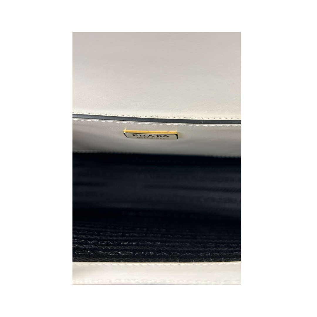 White saffiano leather exterior, black PRADA logo fabric interior, and gold-tone hardware. Features leather shoulder strap that can be worn doubled or fully extended and flap with snap closure. Includes certificate of authenticity, original dust bag, and box.