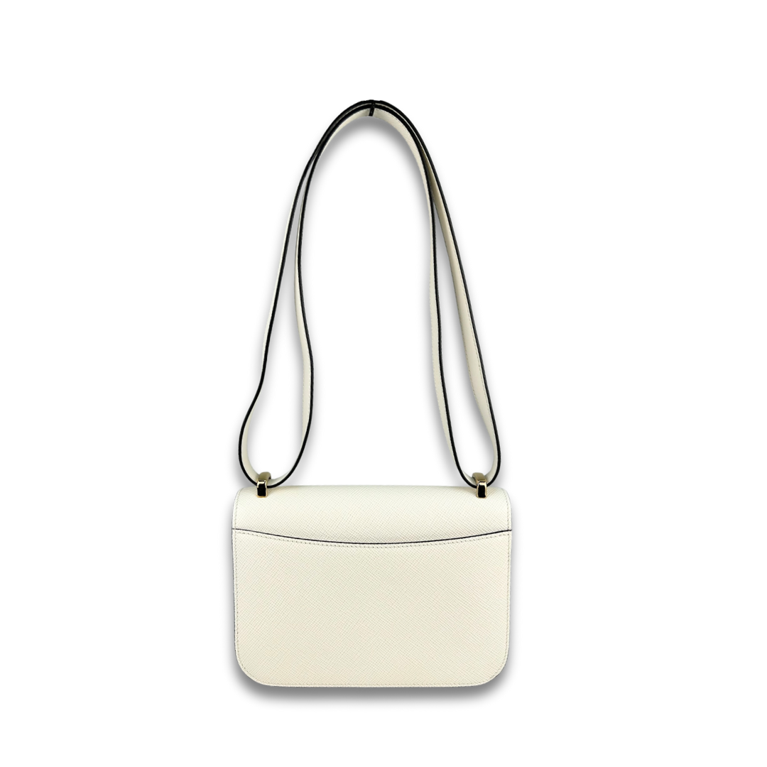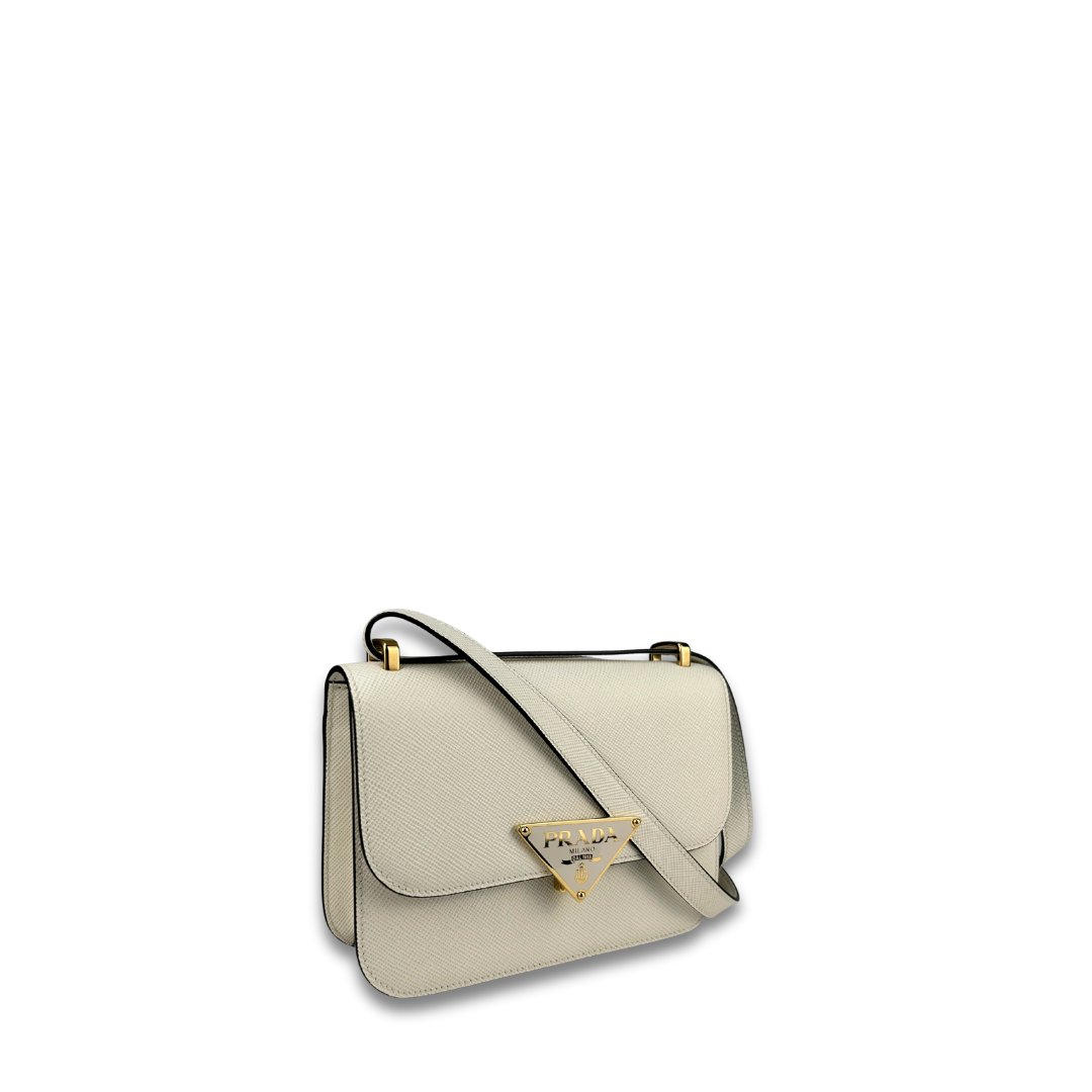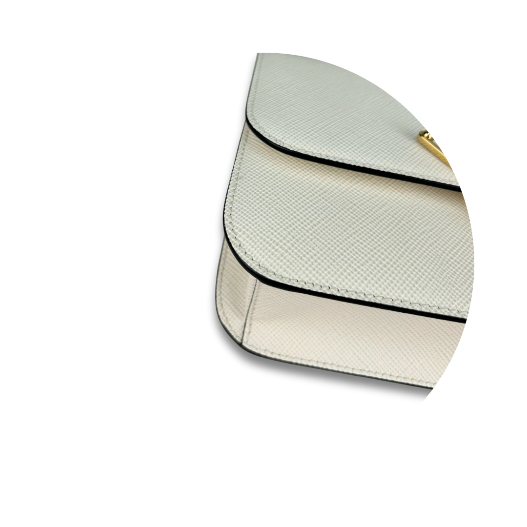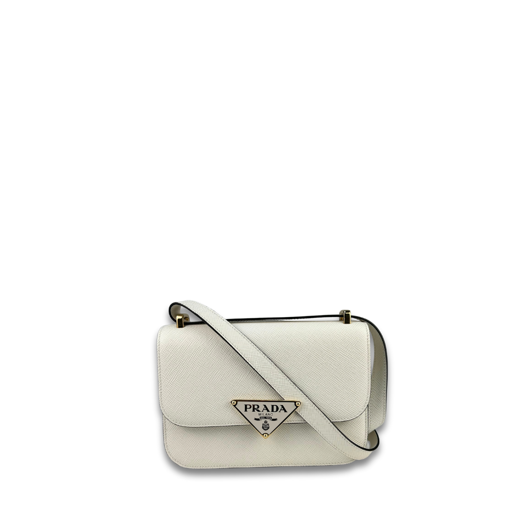 White saffiano leather exterior, black PRADA logo fabric interior, and gold-tone hardware. Features leather shoulder strap that can be worn doubled or fully extended and flap with snap closure. Includes certificate of authenticity, original dust bag, and box.
