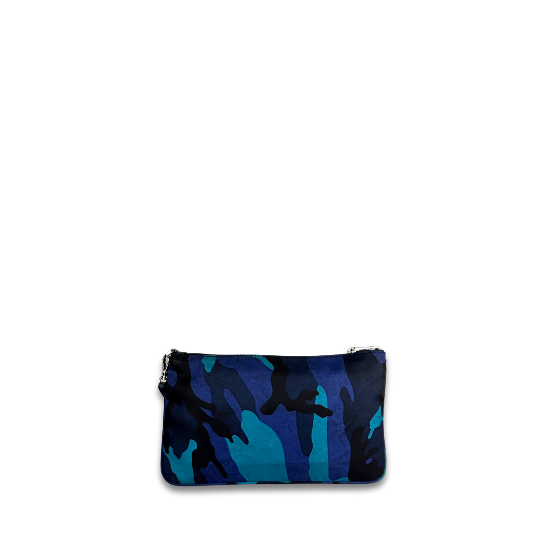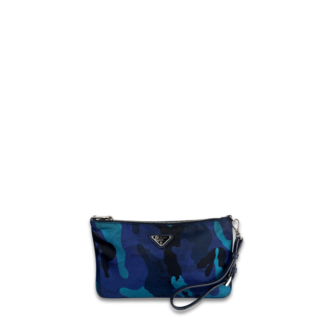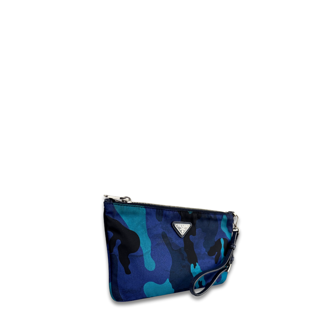 Teal, blue, and black camouflage fabric exterior, with black Prada lined canvas interior, and silver-tone hardware. Features detachable wristlet strap, zipper closure, and interior zipper pocket. Includes certificate of authenticity.