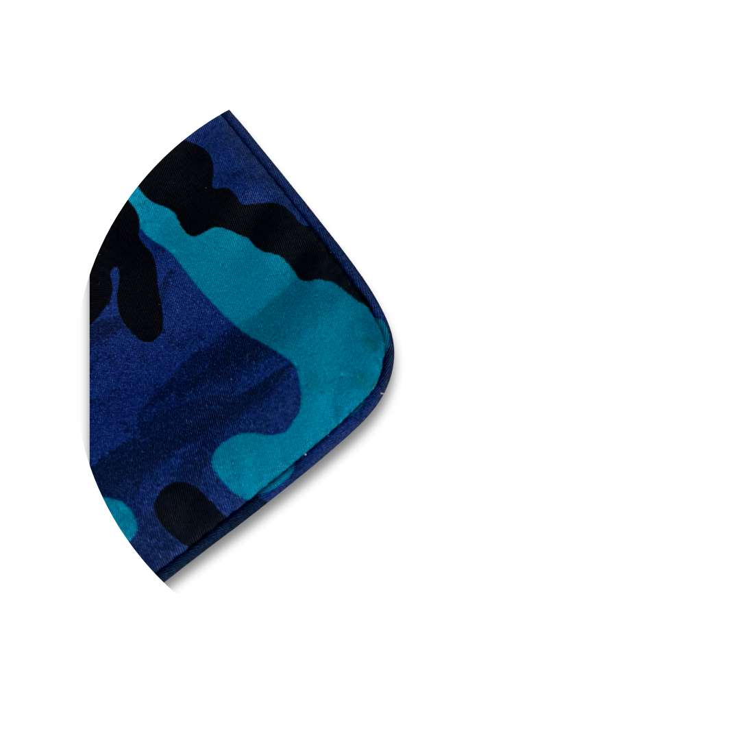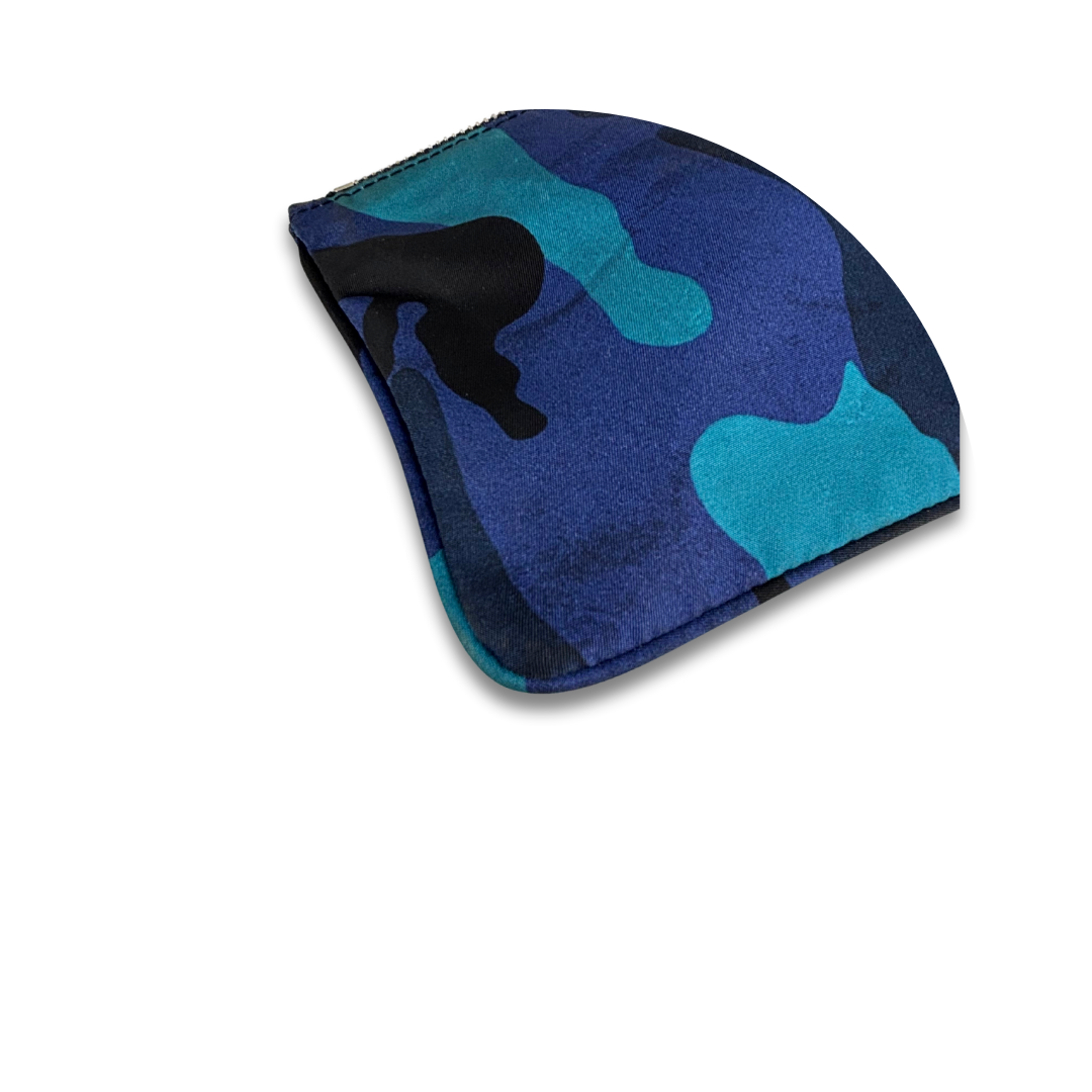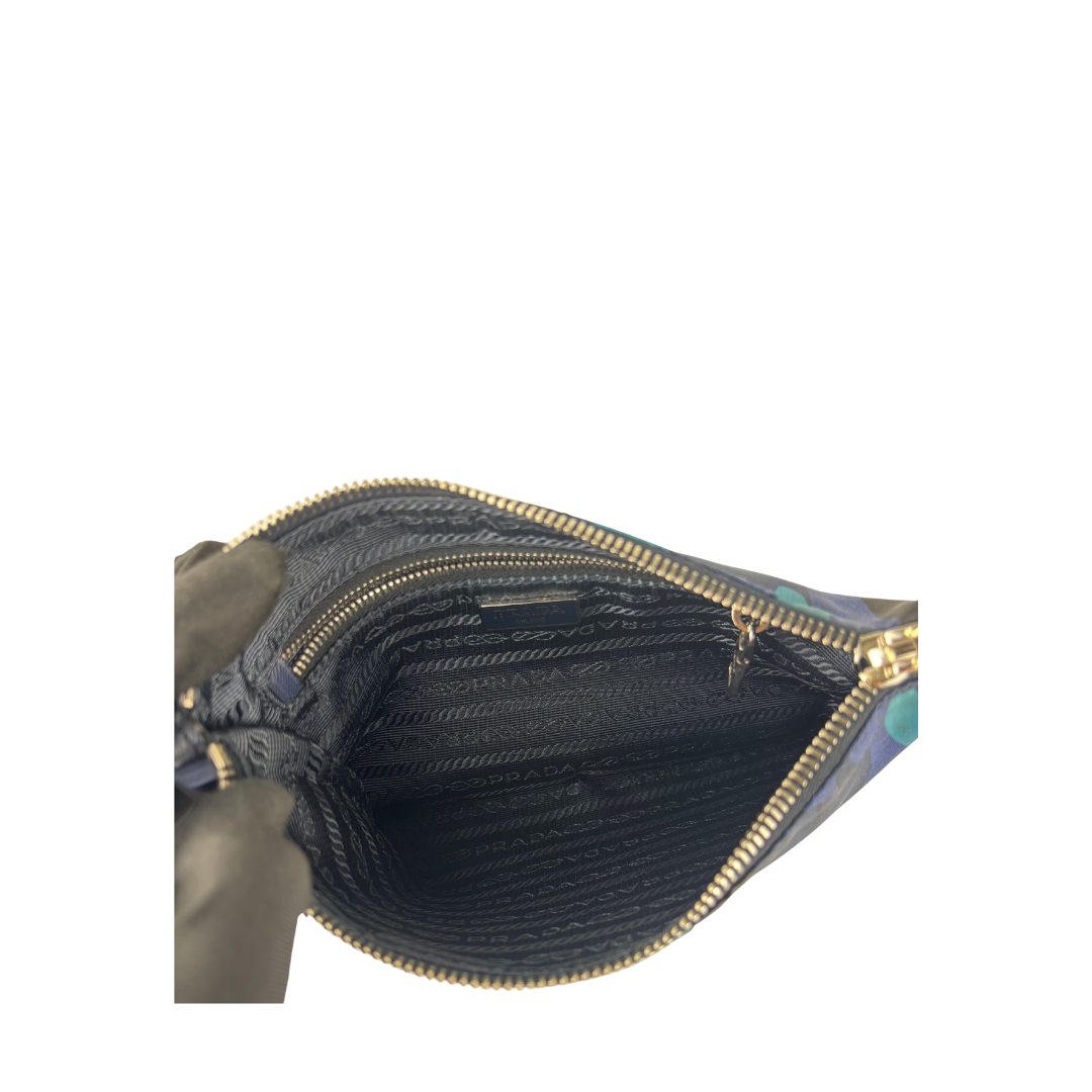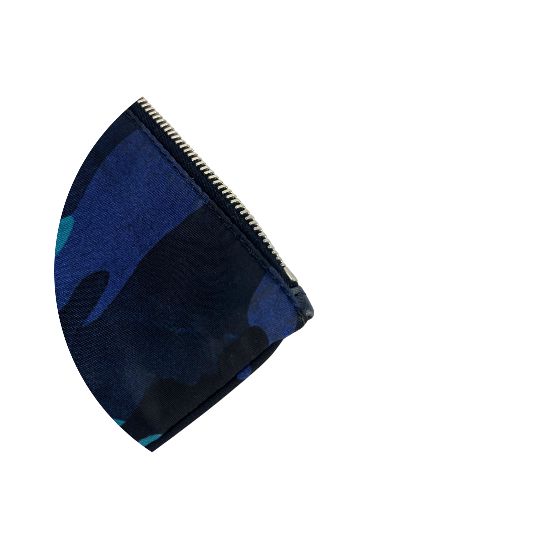 Teal, blue, and black camouflage fabric exterior, with black Prada lined canvas interior, and silver-tone hardware. Features detachable wristlet strap, zipper closure, and interior zipper pocket. Includes certificate of authenticity.