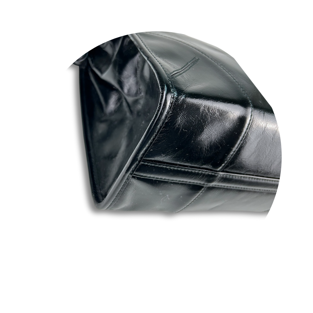 Black shiny calfskin exterior with black jacquard interior, and gold-tone hardware. Features leather top handles, zip-top closure, detachable and adjustable leather strap, and interior zipper pocket. Includes certificate of authenticity and original dust bag.