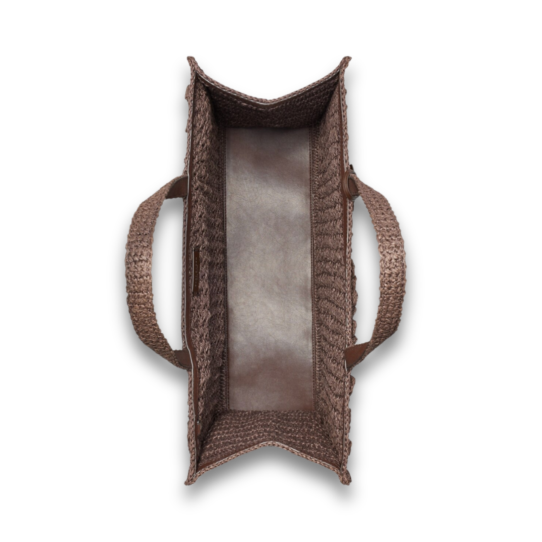 Inspired by the art and traditions of basketry, the Large Ella Hand-Crocheted Tote is crafted in paper raffia with a textured popcorn stitch and our hanging Double T charm. Lightweight and laidback, it’s ideal for casual city days and beach getaways. Finished with an interior D-ring to keep keys close at hand, it fits a wallet, phone, water bottle, book and sunglasses.