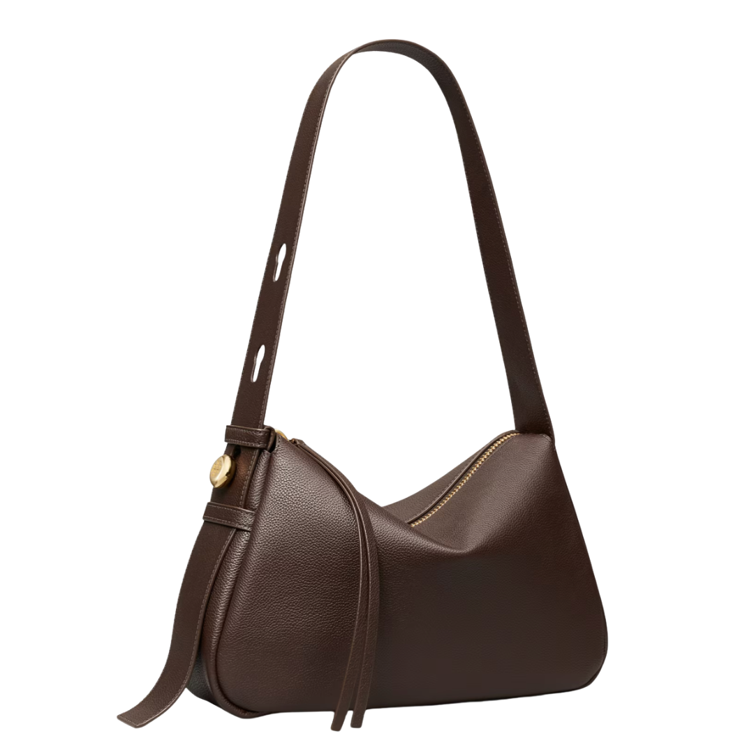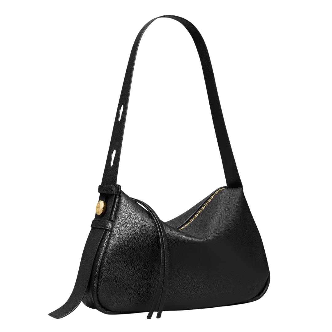 The ultimate everyday handbag. Sculptural yet soft and easy on the go, the Romy Shoulder Bag is crafted in rich pebbled leather. Lightweight with a spacious interior organized with a deep zip pocket, it can fit a phone, wallet, sunglasses, tablet and keys. A wide shoulder strap adjusts with our new button logo.