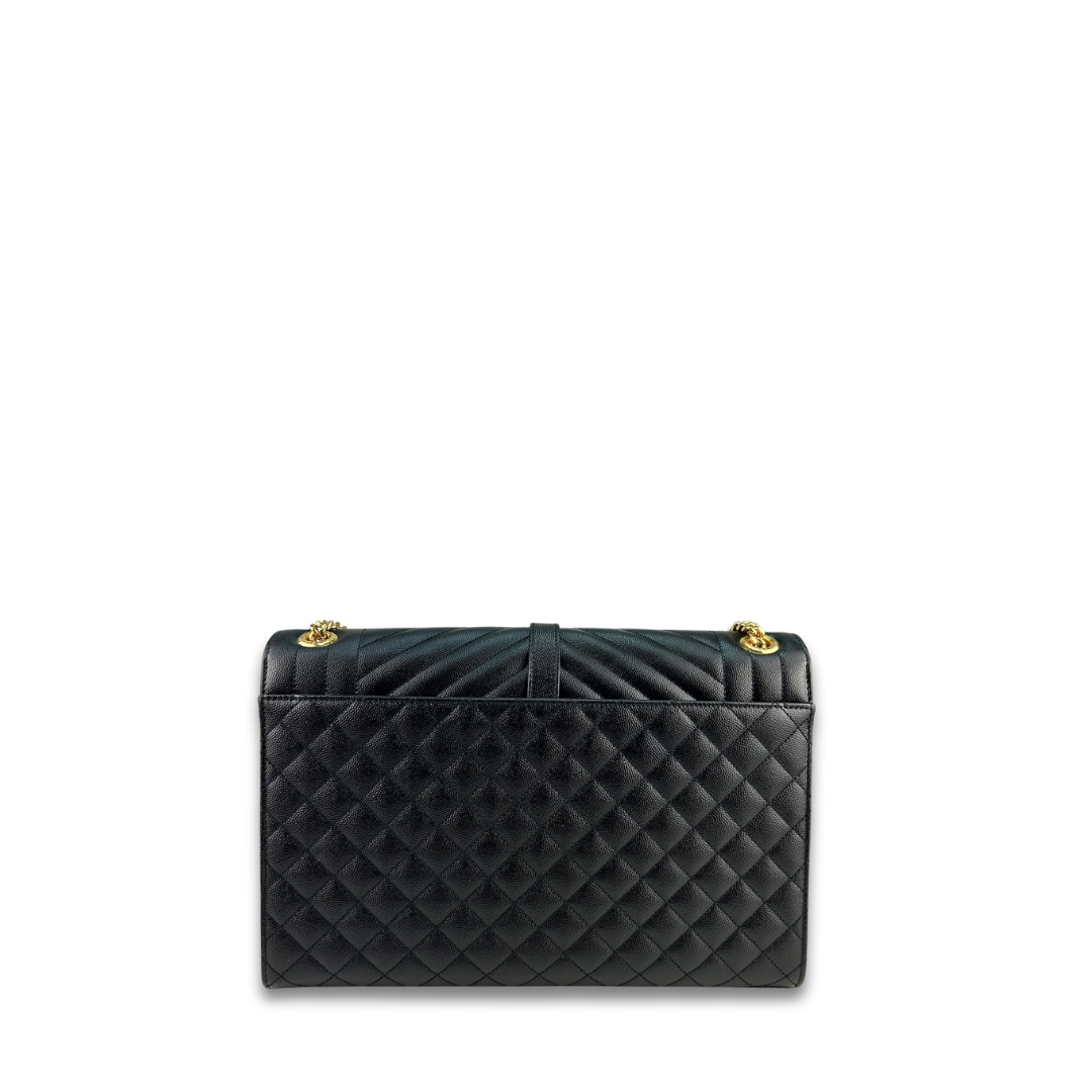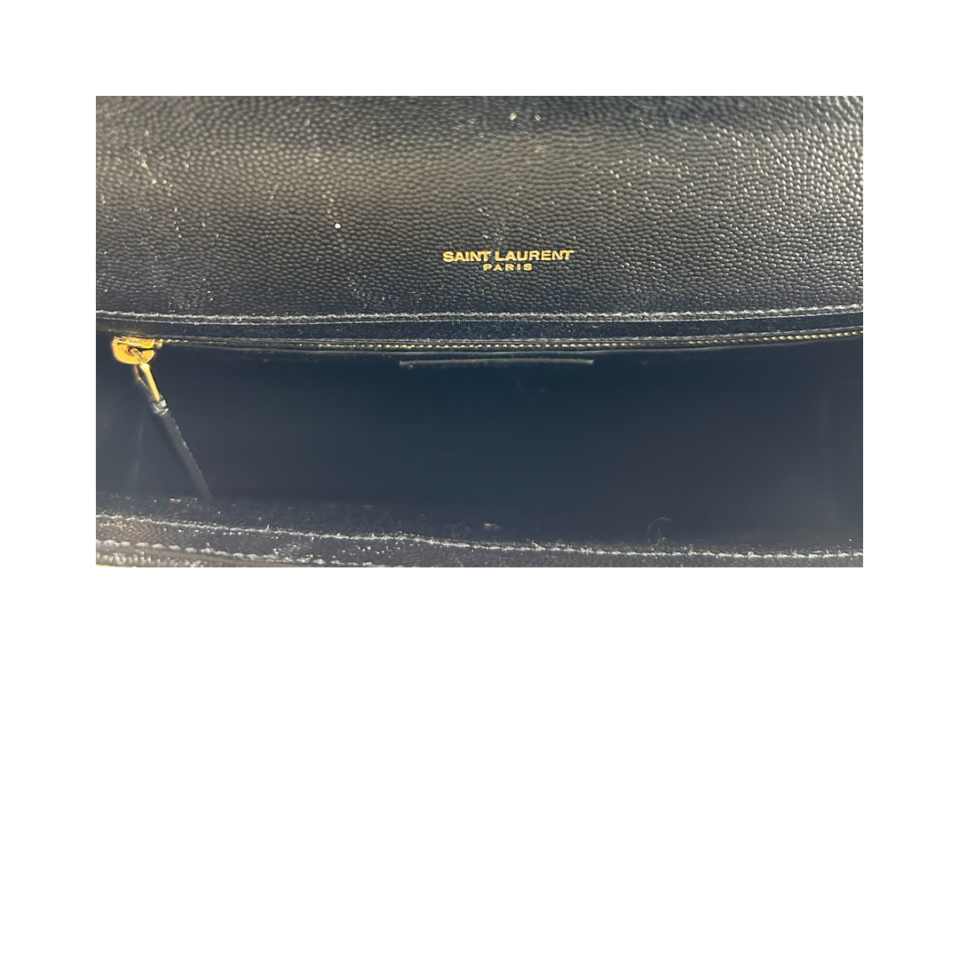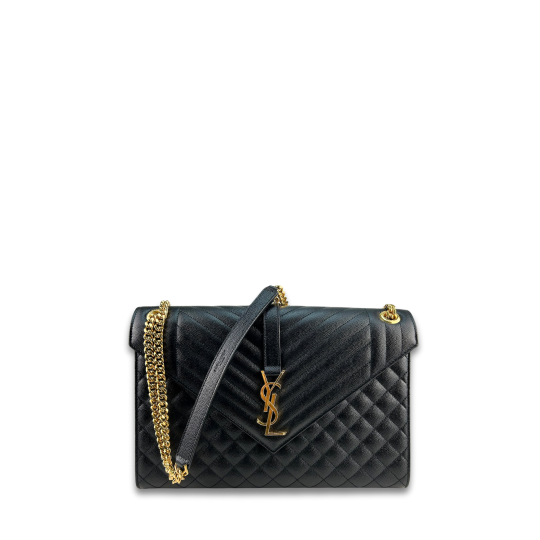 Black chevron quilted leather exterior, black grosgrain interior, gold-tone hardware. Features YSL interlaced metal logo, magnetic snap closure, rear exterior pocket, chain straps with leather shoulder guards, zipper pocket. Includes certificate of authenticity and original dust bag.