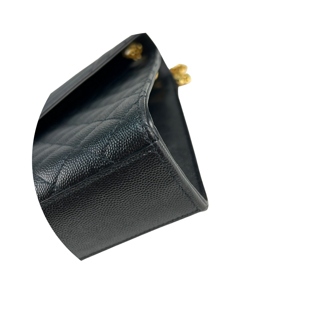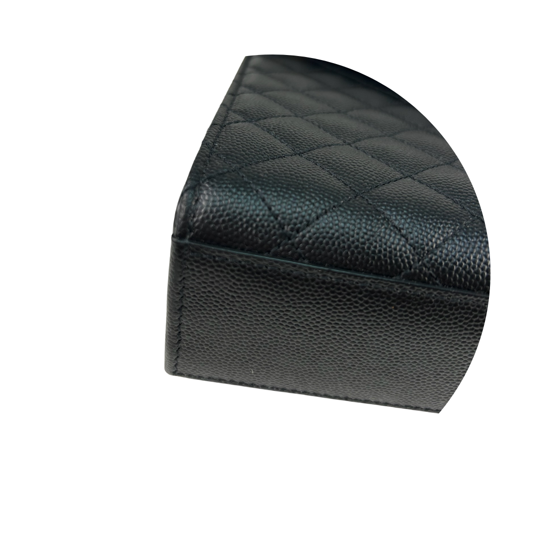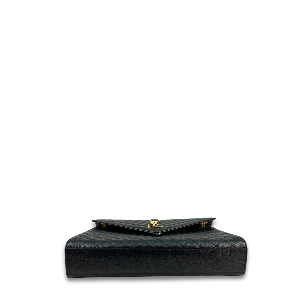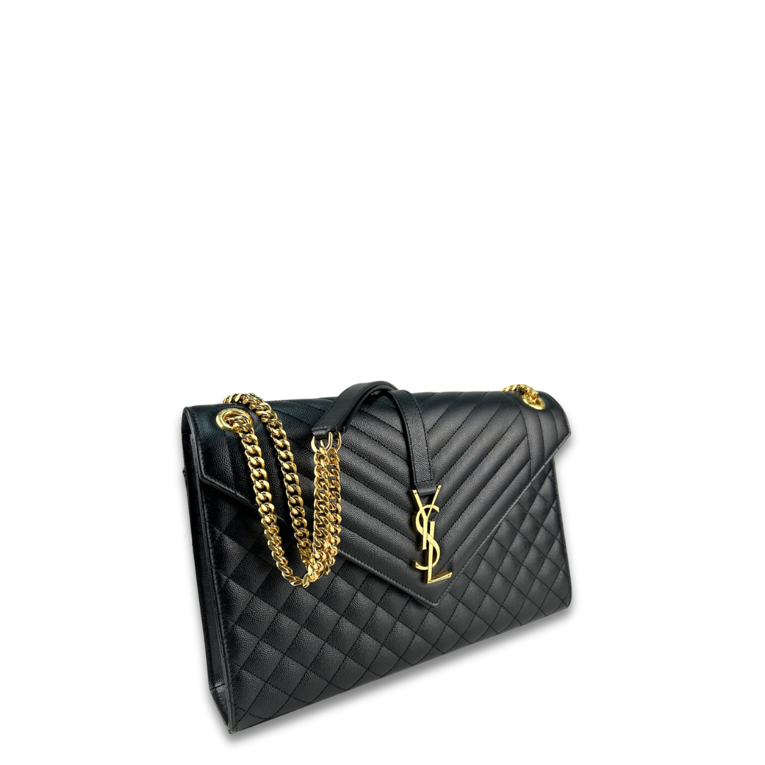 Black chevron quilted leather exterior, black grosgrain interior, gold-tone hardware. Features YSL interlaced metal logo, magnetic snap closure, rear exterior pocket, chain straps with leather shoulder guards, zipper pocket. Includes certificate of authenticity and original dust bag.