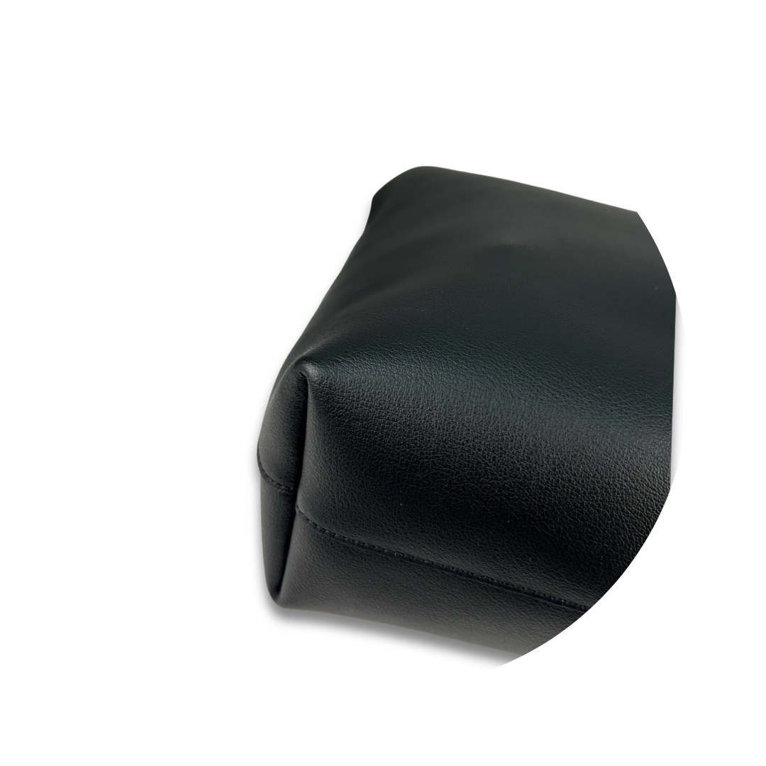 Black leather exterior with tonal suede interior and gold-tone hardware. Features dual leather shoulder straps, magnetic closure, and interior detachable pouch. Includes certificate of authenticity.